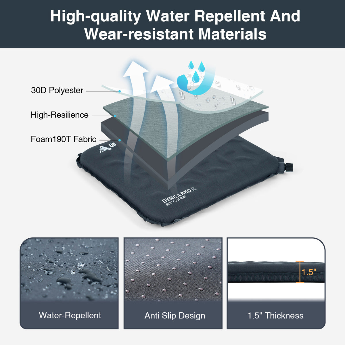 【Soft Yet Durable:】Dynisland Inflatable Seat Cushion using 30D polyester TPU waterproof fabric, it is environmentally friendly, skin-friendly, tear resistant, no noise, and waterproof performance is good. The bottom fabric is made of non-slip particles, which can be stable in any terrain environment, ensuring always excellent performance.