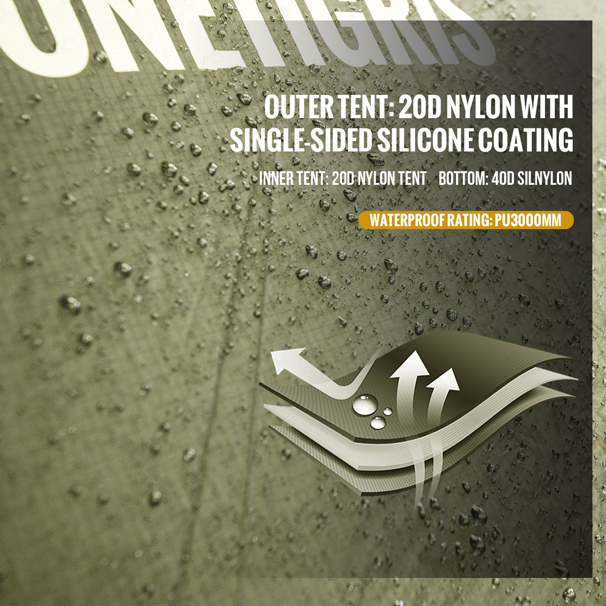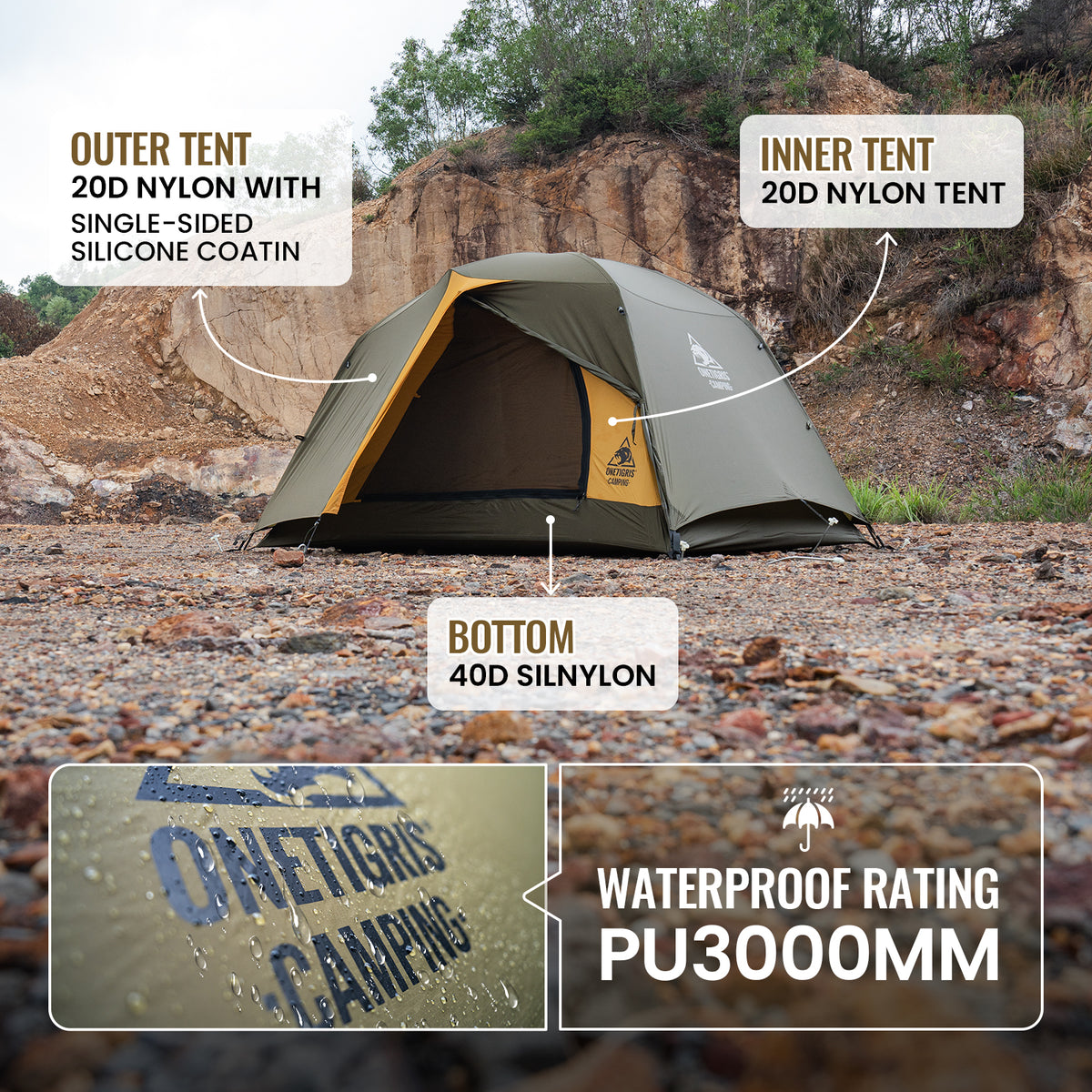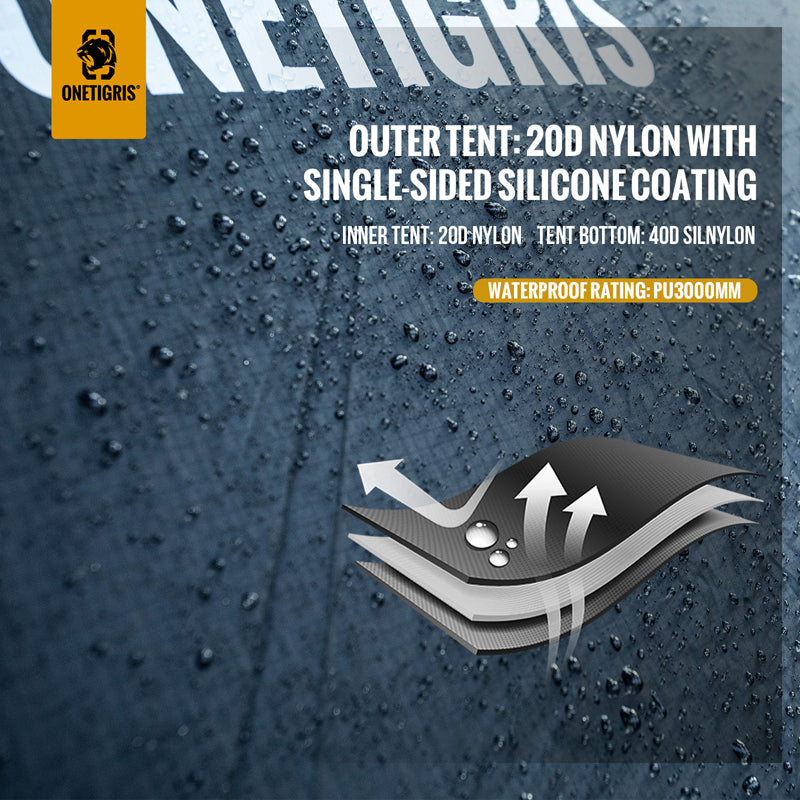 Material: 20D Ripstop Nylon Outer Tent, 40D Polyester Tent Bottom, 20D Inner Tent, 7001 Aluminum Alloy Tent Poles