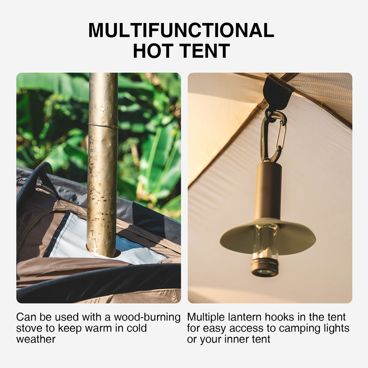 | WINTER HOT TENT: One stove pipe opening for burning stoves with a flue pipe, so that even when camping in snowfall the snow will melt and not build up.