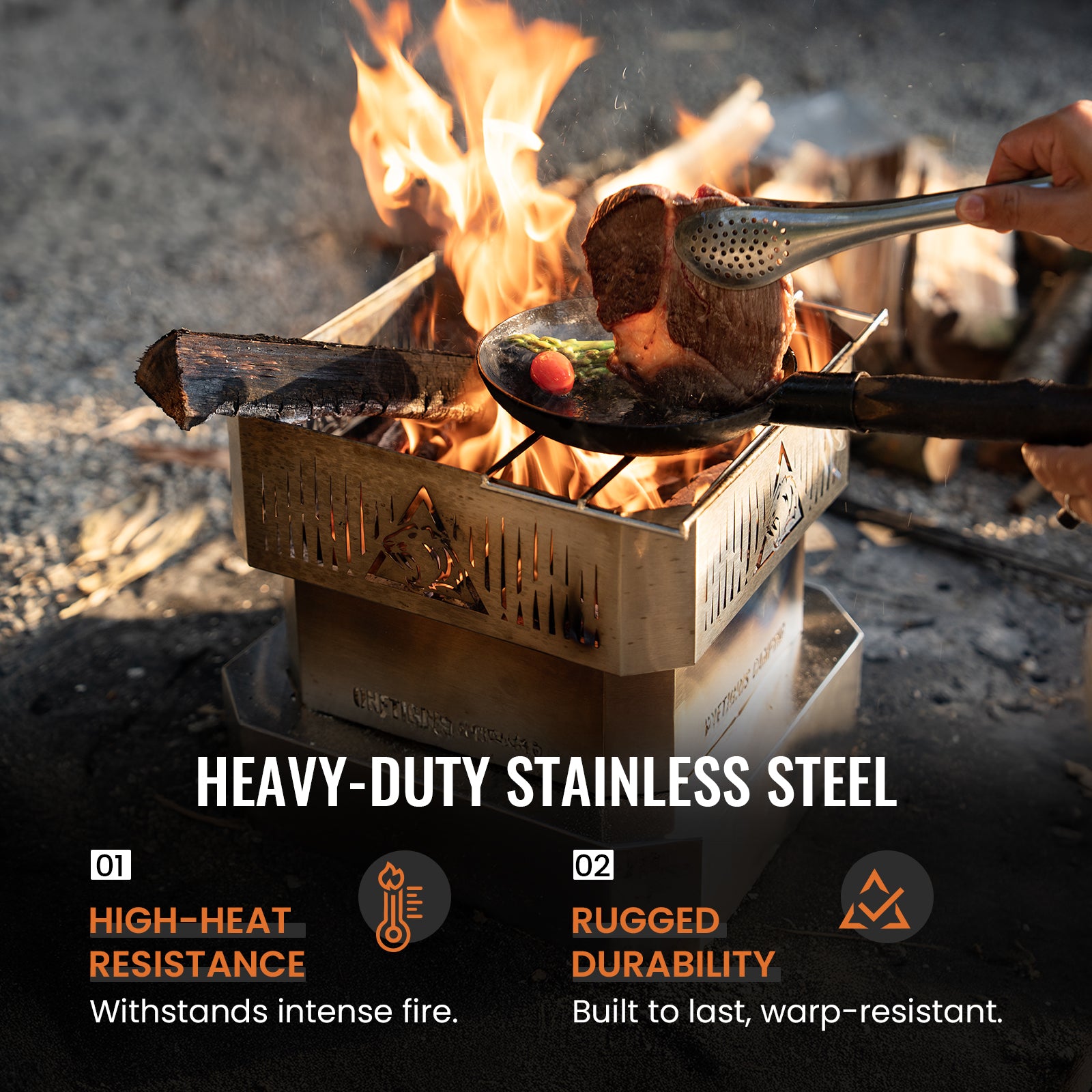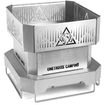 持ち運び可能なステンレス製ファイヤーピット。素早く積み重ねて設置でき、効率的な空気の流れとコンパクトな収納設計で、キャンプやアウトドアクッキングに最適です。