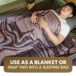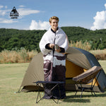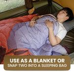 キャンプ用キルトは寝袋の代わりとして人気があり、寝袋と同等の暖かさと快適さを提供しながら、より自由に動けて多用途に使用できます。当社のアップグレードされた特大キャンプ用ブランケットは最大 7 フィート x 6.7 フィートで、市場のほとんどのものよりも大きく幅広です。1 人でも 2 人でも、気温 46°F ~ 77°F (8°C ~ 25°C) でふっくらと暖かな保護を提供します。20D ナイロン製のアウターシェルは他の素材よりも耐水性と耐油性に優れており、キルトにはポンチョやマントに変身できる高品質のスナップボタンが付いており、火のそばで過ごす肌寒い朝や夕方に特に便利です。